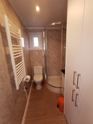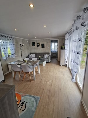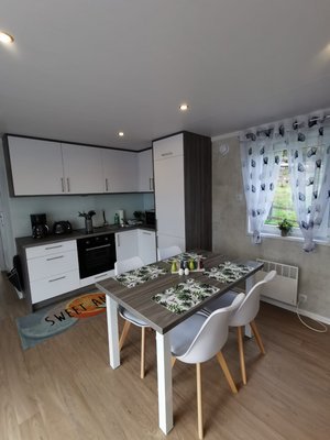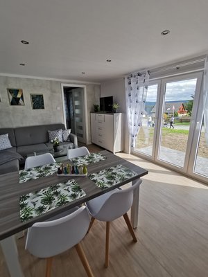 Der Wohn- Essraum ist geräumig und ausgestattet mit einer großzügigen Küche (Geschirrspüler, Herd, Kühlschrank) mit Esstisch sowie TV und einer Couch.