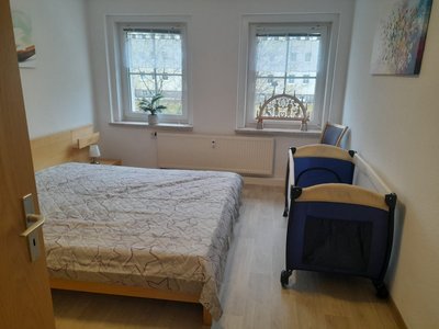 Im Schlafzimmer steht ein Doppelbett (180x200 cm) und es besteht die Möglichkeit, ein Babybett (in der Ferienwohnung vorhanden) aufzustellen.