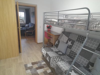 Das Wohnzimmer verfügt über TV mit DVD-Player und eine ausziehbare Schlafcouch. Das Kinderzimmer ist mit einem Doppelstockbett ausgestattet, welches je nach Nutzungswunsch unten eine Sitzgelegenheit oder ein Bett (140x200 cm) beinhaltet. In der Küche können Sie an einem großen Esstisch Ihre Mahlzeiten einnehmen. Dort steht für die kleinen Gäste ein Kinderstuhl bereit. In der modern eingerichteten und voll ausgestatteten Küche finden Sie u.a. Herd inkl. Backofen, Spülmaschine, Toaster, Wasserkocher, Mikrowelle, Kaffeemaschine und Kühlschrank mit Gefrierfach.