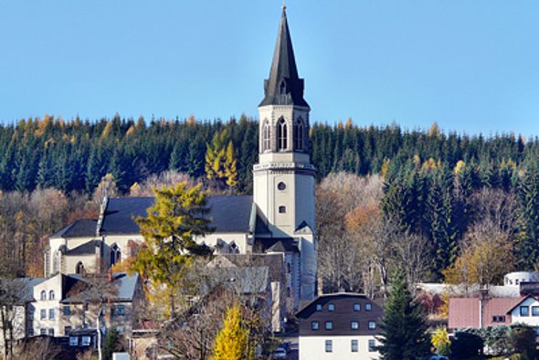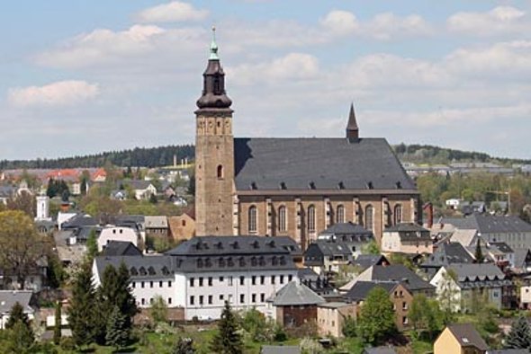 Die neue evangelisch-lutherische Stadtkirche wurde am 27. August 1872 geweiht. Nach Plänen der Architekten Arnold und Pfau aus Annaberg wurde sie im neugotischen Stil in Form einer dreischiffigen fünfjochigen Halle mit eingezogenem Chor wieder aufgebaut. Der Turm erreicht mit dem darauf befindlichem Kreuz eine Höhe von 67 m.